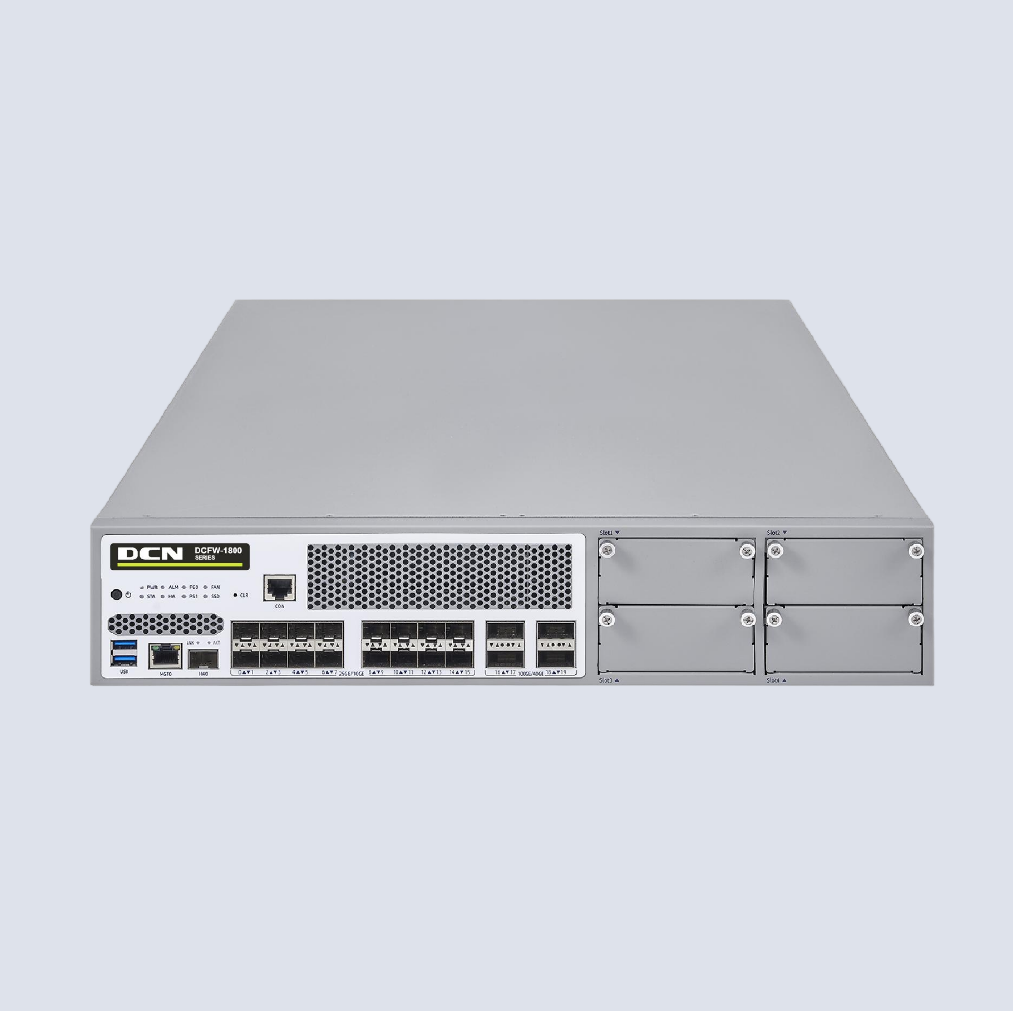 DCFW-1800-N7660-G 软硬件平台基本系统,含硬件保修、应用识别库升级和软件升级维护服务。硬件参数:2U,1 个CON 口,1 个MGT口,1个HA口,2个USB口,4个100G光口(向下兼容40G),16个25G光口(向下兼容10G和1G)。4个通用扩展槽